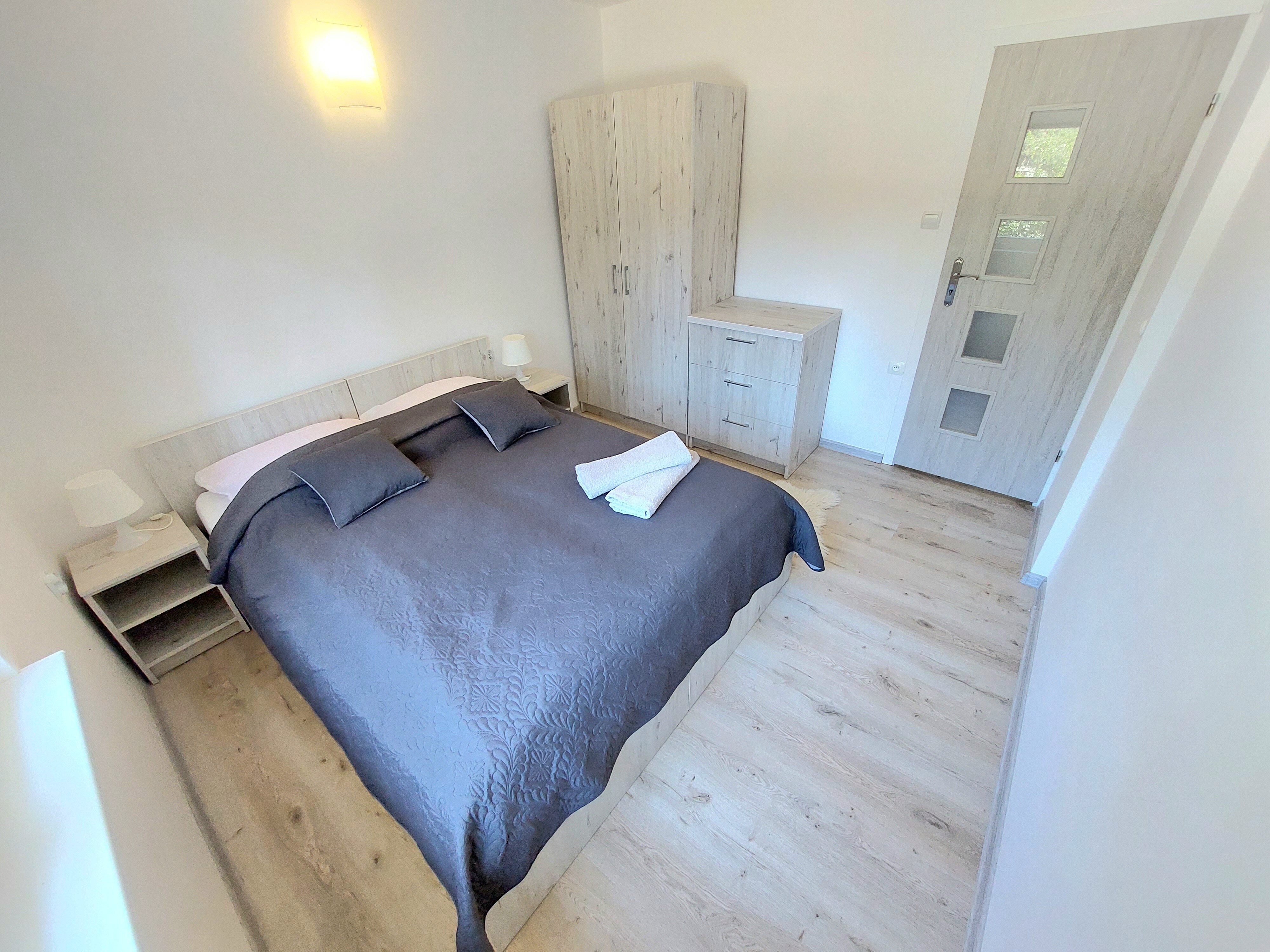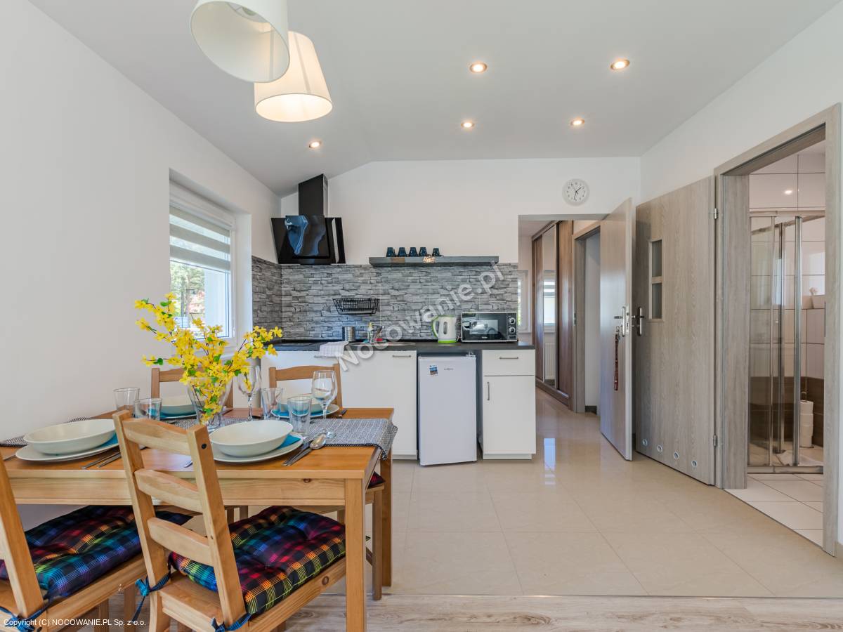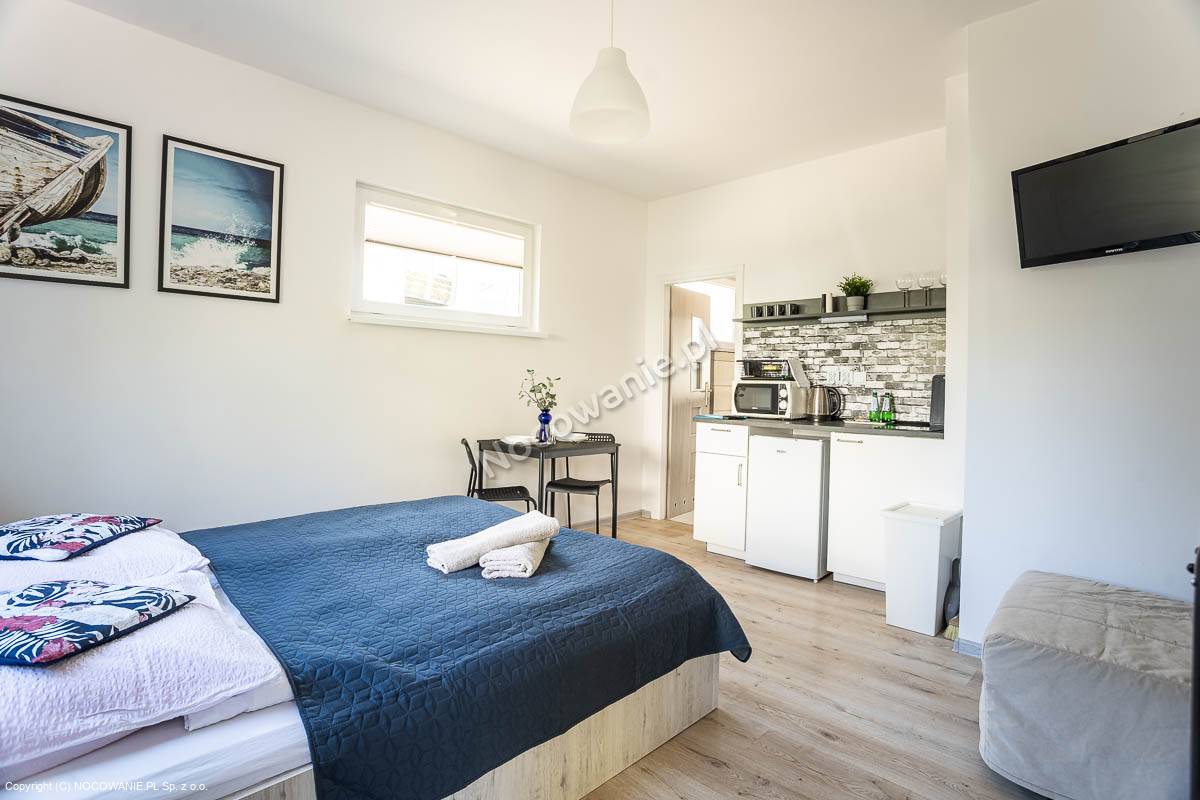 W apartamencie znajduje się szerokie łóżko małżeńskie, aneks kuchenny (brak zlewu) oraz rozkładany fotel, łazienka z kabiną prysznicową.
