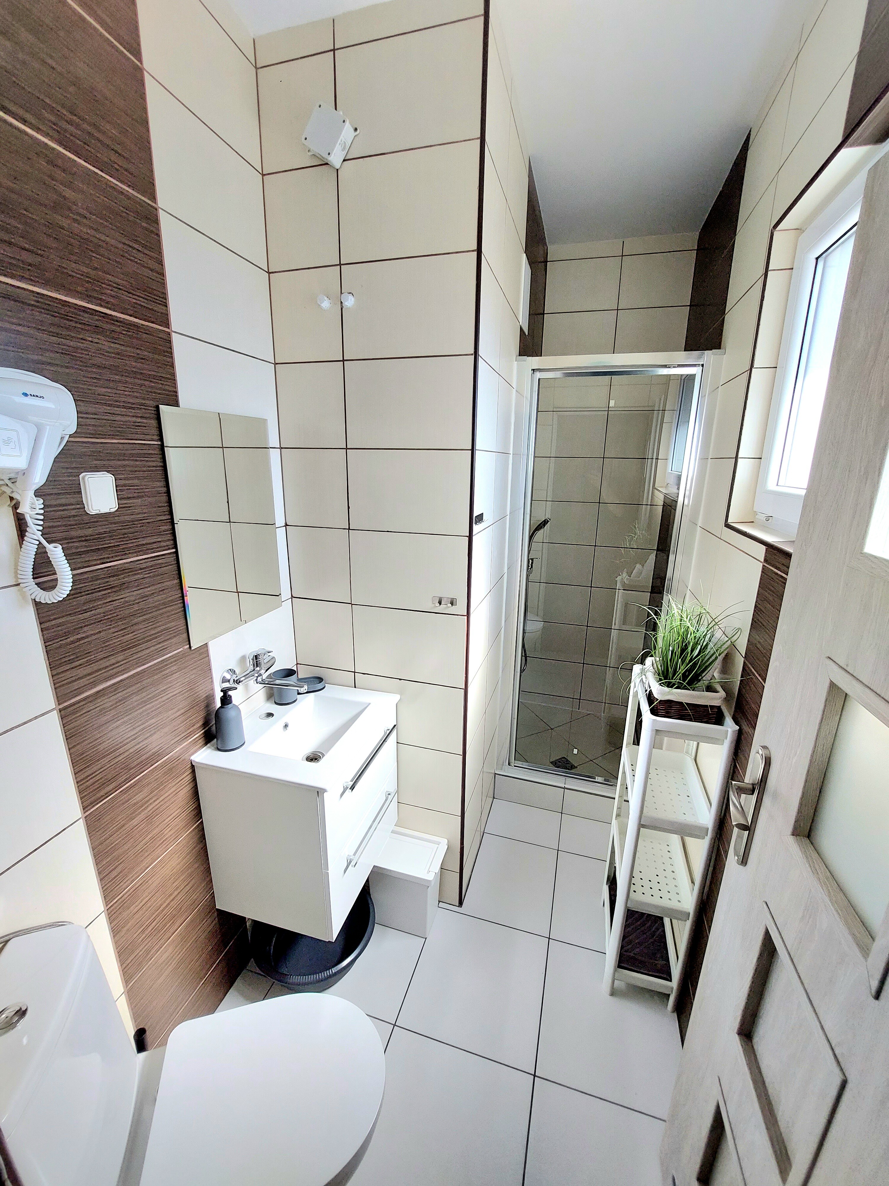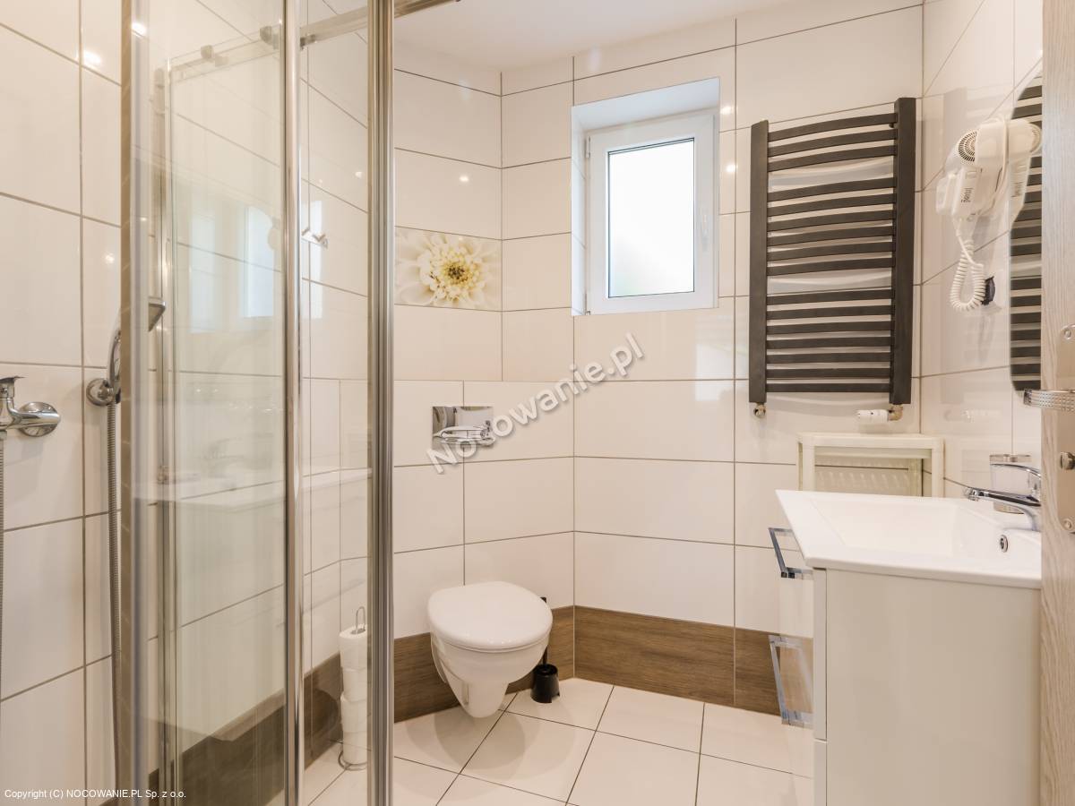 łazienka z kabiną prysznicową, suszarka do włosów, ręczniki,