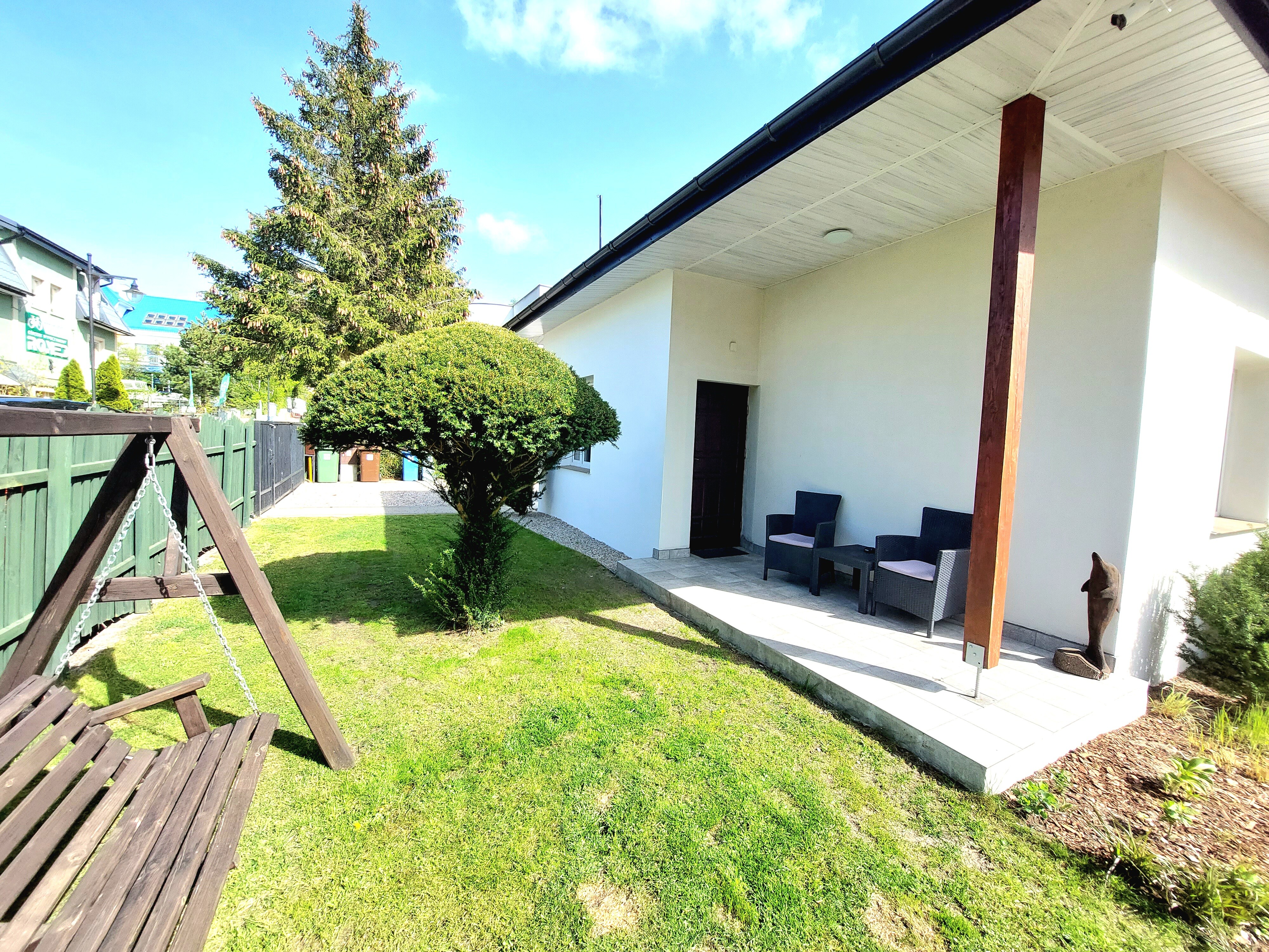 Dodatkowym atutem apartamentu jest bezpośrednie wyjście na ogród oraz w pełni umeblowany taras z widokiem na cały ogród.