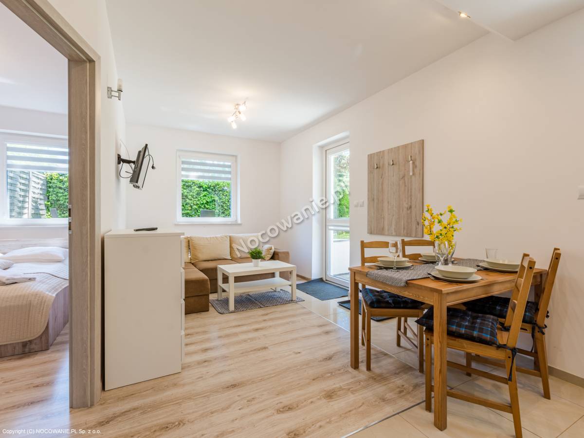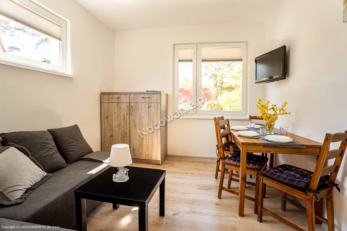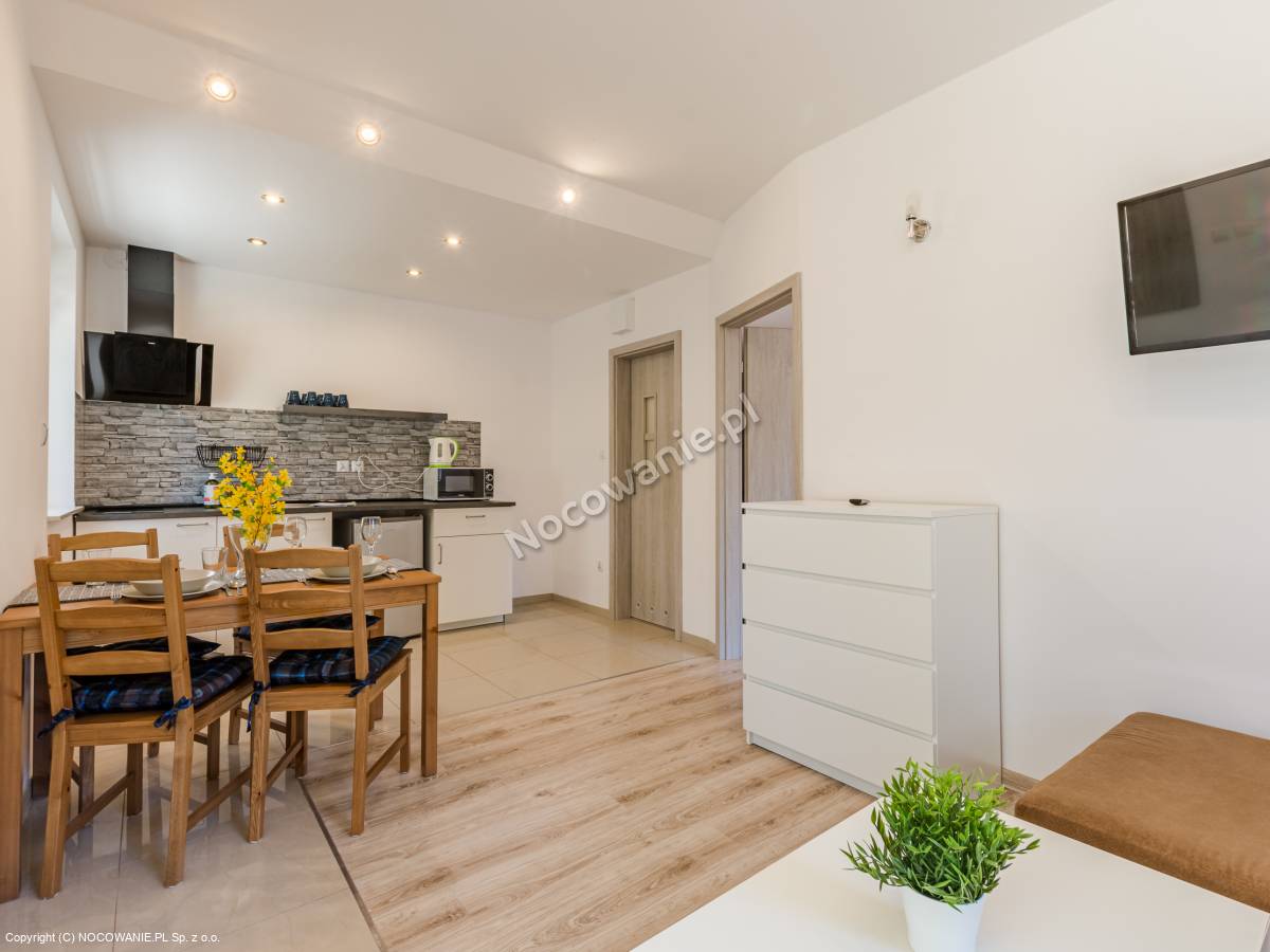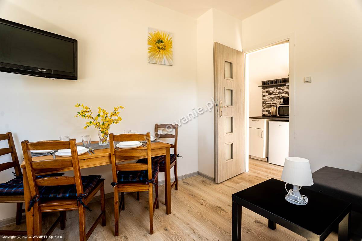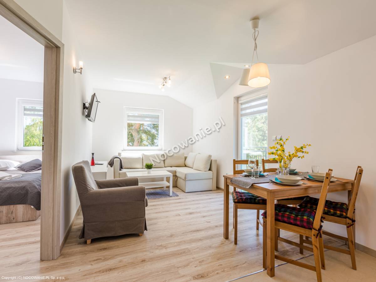 W apartamencie znajduje się salon z rozkładanym narożnikiem i w pełni wyposażonym aneksem kuchennym, część jadalniana, łazienka z kabiną prysznicową oraz sypialnia z szerokim łóżkiem małżeńskim.