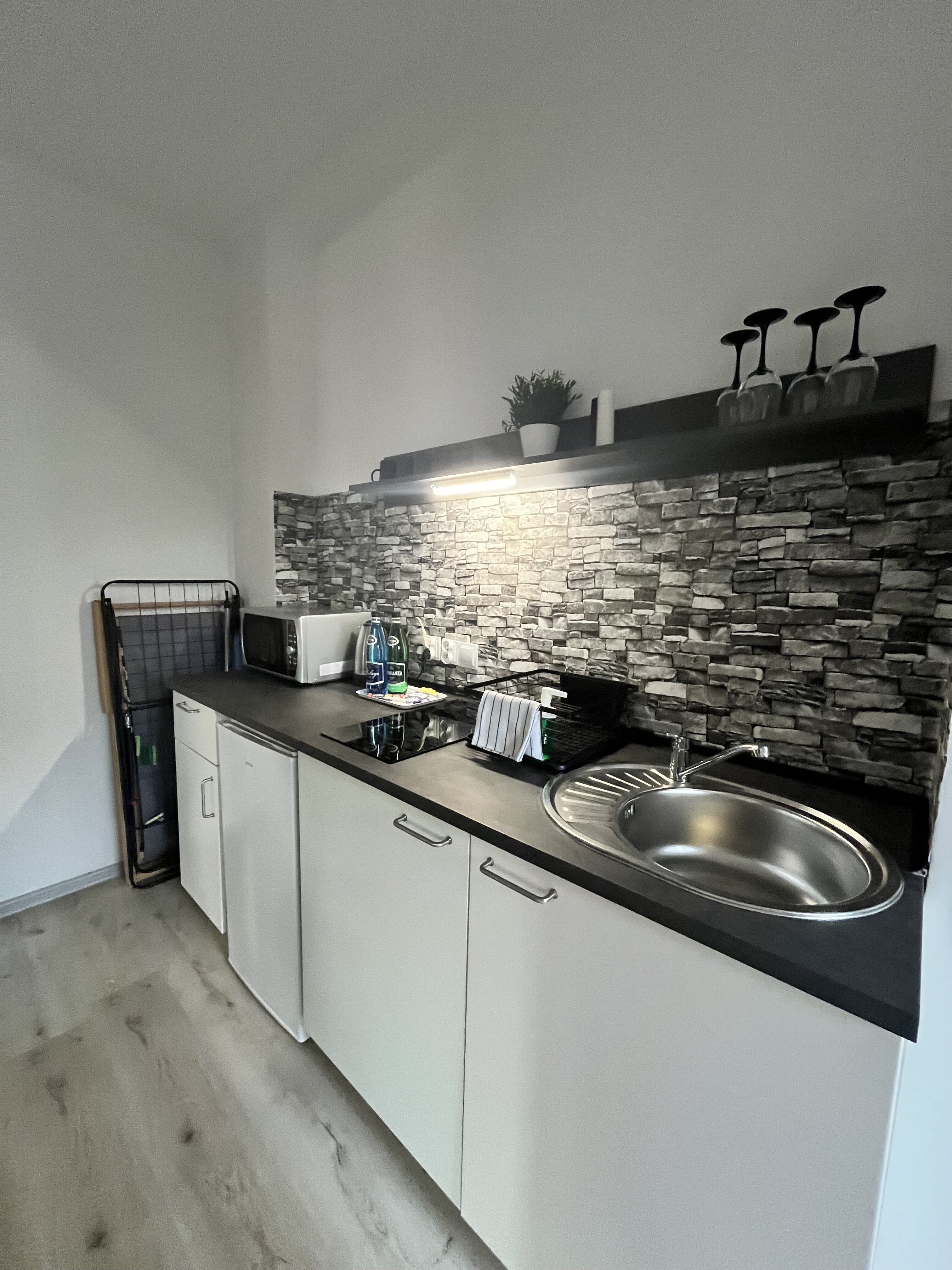 w pełni wyposażona kuchnia (lodówka, płyta grzewcza, mikrofalówka, czajnik elektryczny, garnki, talerze, sztućce, szklanki, kieliszki),